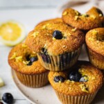 Wash and dry the blueberries then coat it with 1 - 2 tsp of tapioca flour**. Then fold in 3/4 of the blueberries and lemon zest. Spoon the batter into the prepared muffin cups, filling them close to the top. Add the rest of the blueberries on top.