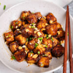 Begin by patting tofu dry, and then cubing tofu. You will then marinate in soy sauce for 20 minutes and then coat in the starch mixture